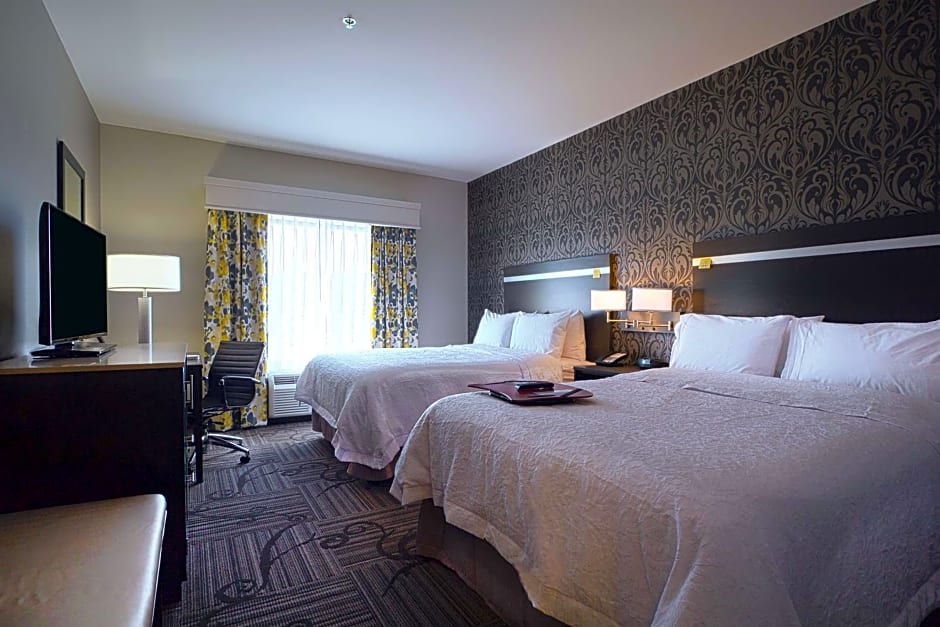 This mobility and hearing accessible, non-smoking room features two queen-sized beds featuring our clean and fresh Hampton bed. The bath is equipped with accessible roll-in shower. The room also has a visual alarm and notification devices for the doorbell or door knock and incoming phone calls. The room features comfortable soft seating, refrigerator, an HDTV, and easy to operate alarm clock/radio. The free WiFi access will help you stay connected while on the road. If you prefer not to work at the desk, you can use the convenient lapdesk instead. You'll also enjoy the convenience of having a coffee maker with tea service and iron/ironing board in your room. Any corresponding photo may not reflect the specific accessible room type or room feature.